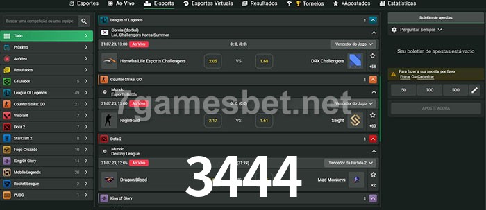 O 3444 oferece uma grande seleção de opções de apostas em e-sports com probabilidades competitivas